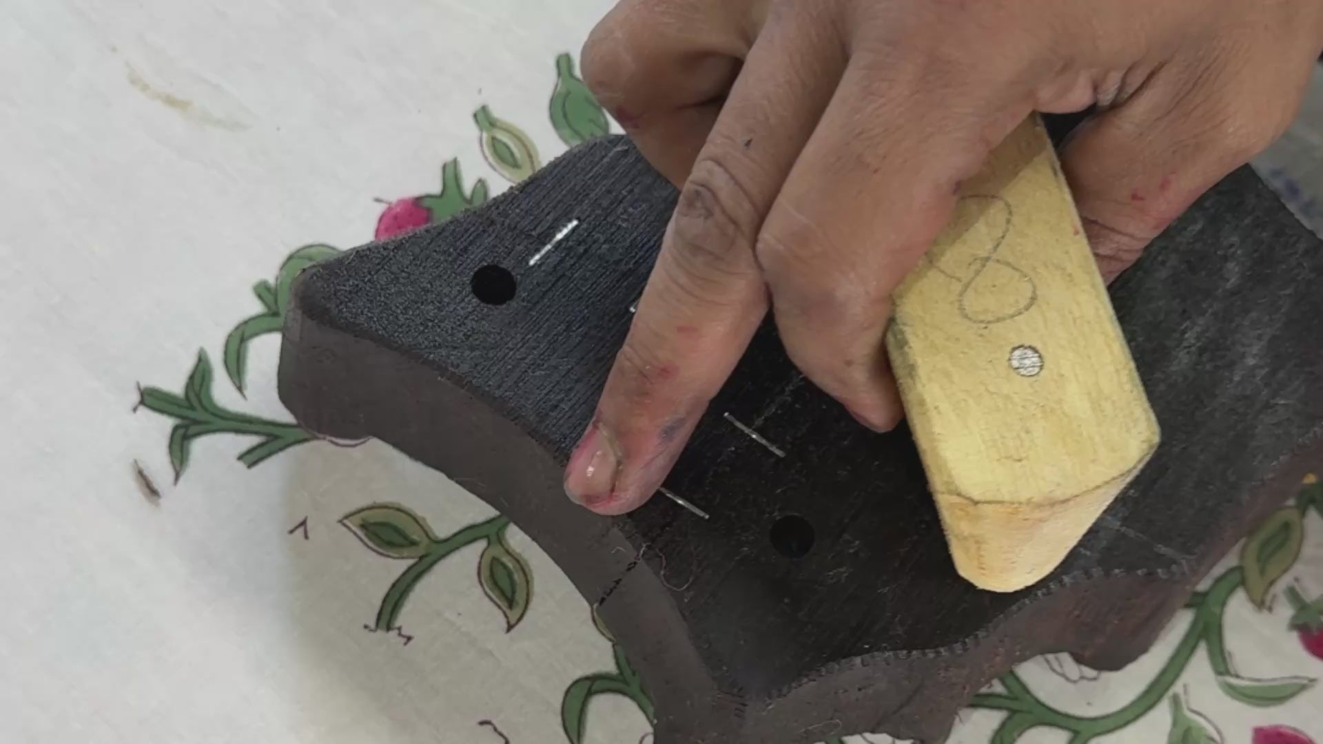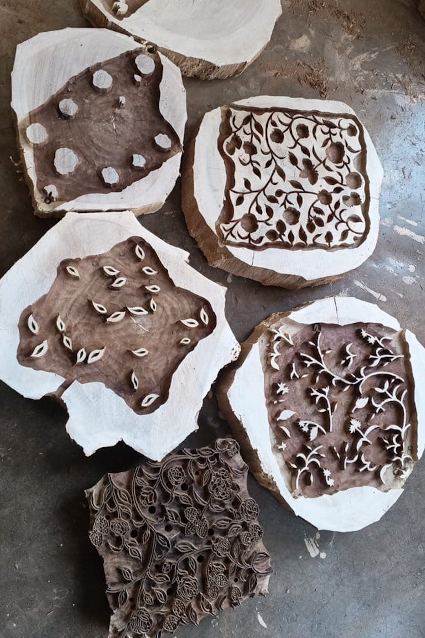 This is my first multicoloured block so it requires 6 separate wooden blocks - one for each colour and print element. Following the pencil markings, skilled artisans carve out the negative spaces to form a raised relief of the design, which will later be inked and pressed onto fabric.