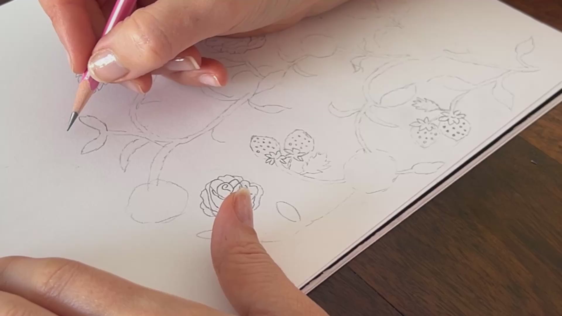 This print brings together fond memories of summers in the Cotswolds - those rare, halcyon days when the sun shines, the berries are ripe, and the roses are in full bloom. For the print, I intertwined the stalks of the strawberries and stems of the roses so that they form a repeat pattern.