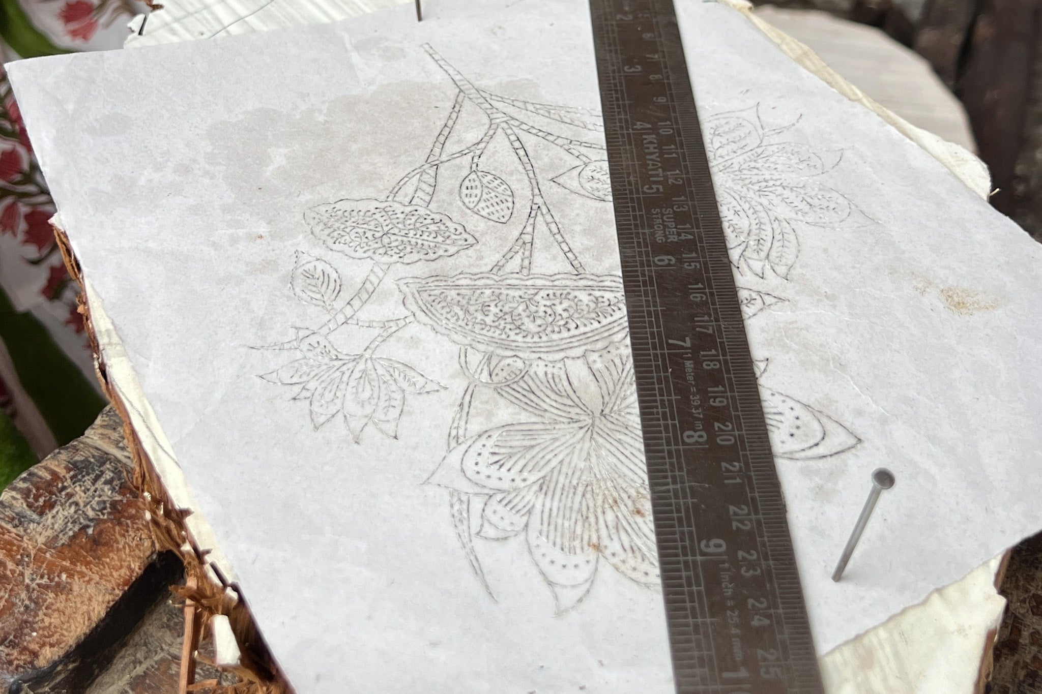 Following the pencil markings, skilled artisans carve out the negative spaces to form a raised relief of the design, which will later be inked and pressed onto fabric.