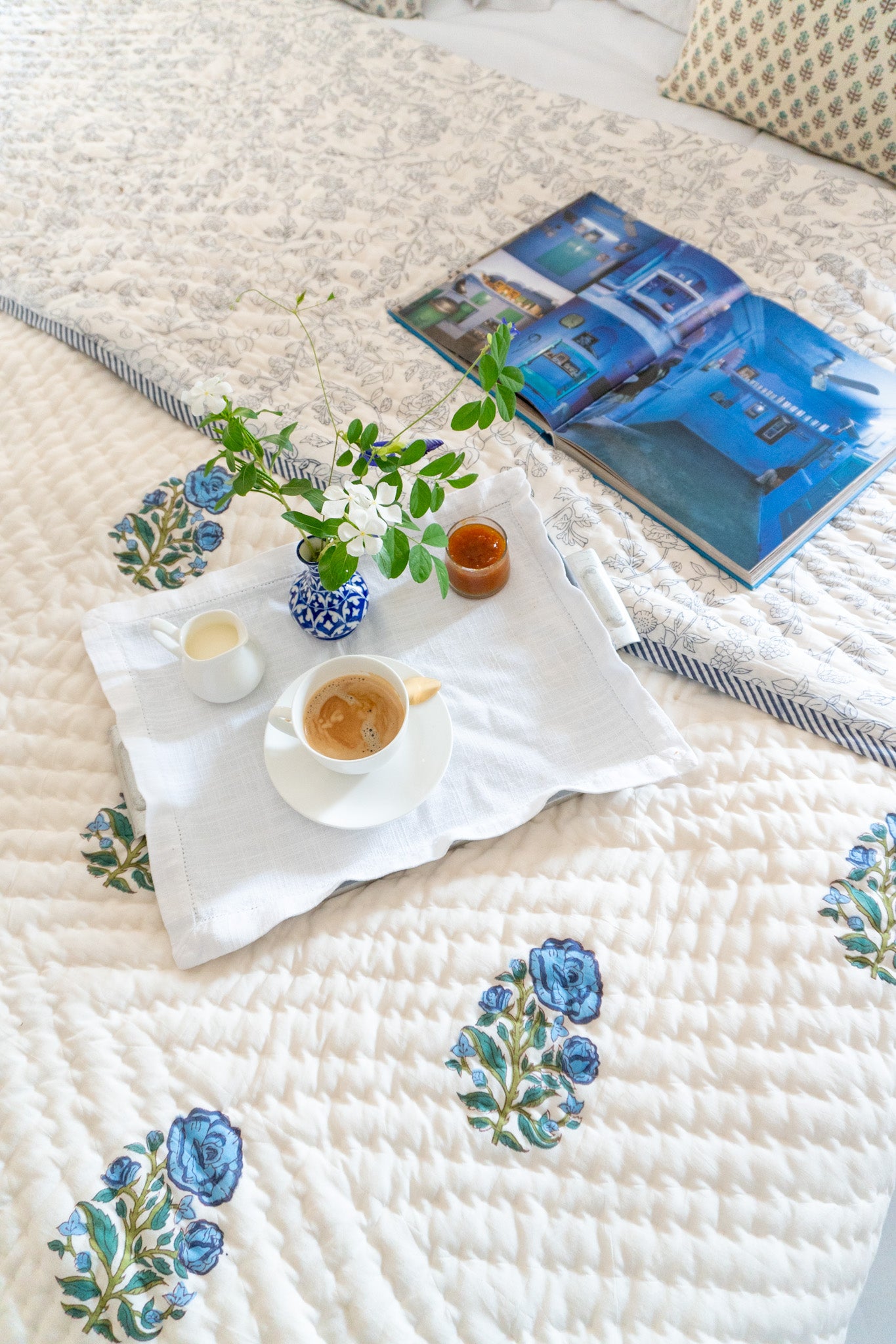 For our first foray into bed linens, it had to be roses. The front of the quilt is hand-block printed with Rosanna’s drawing of a Sweet Juliet rose, with powder and royal blue petals unfurled. Fully reversible, the back of the quilt features the Wild Garden print in cobalt blue. Whichever way it is turned, it will bring joy to the bedroom (not to mention warmth).
