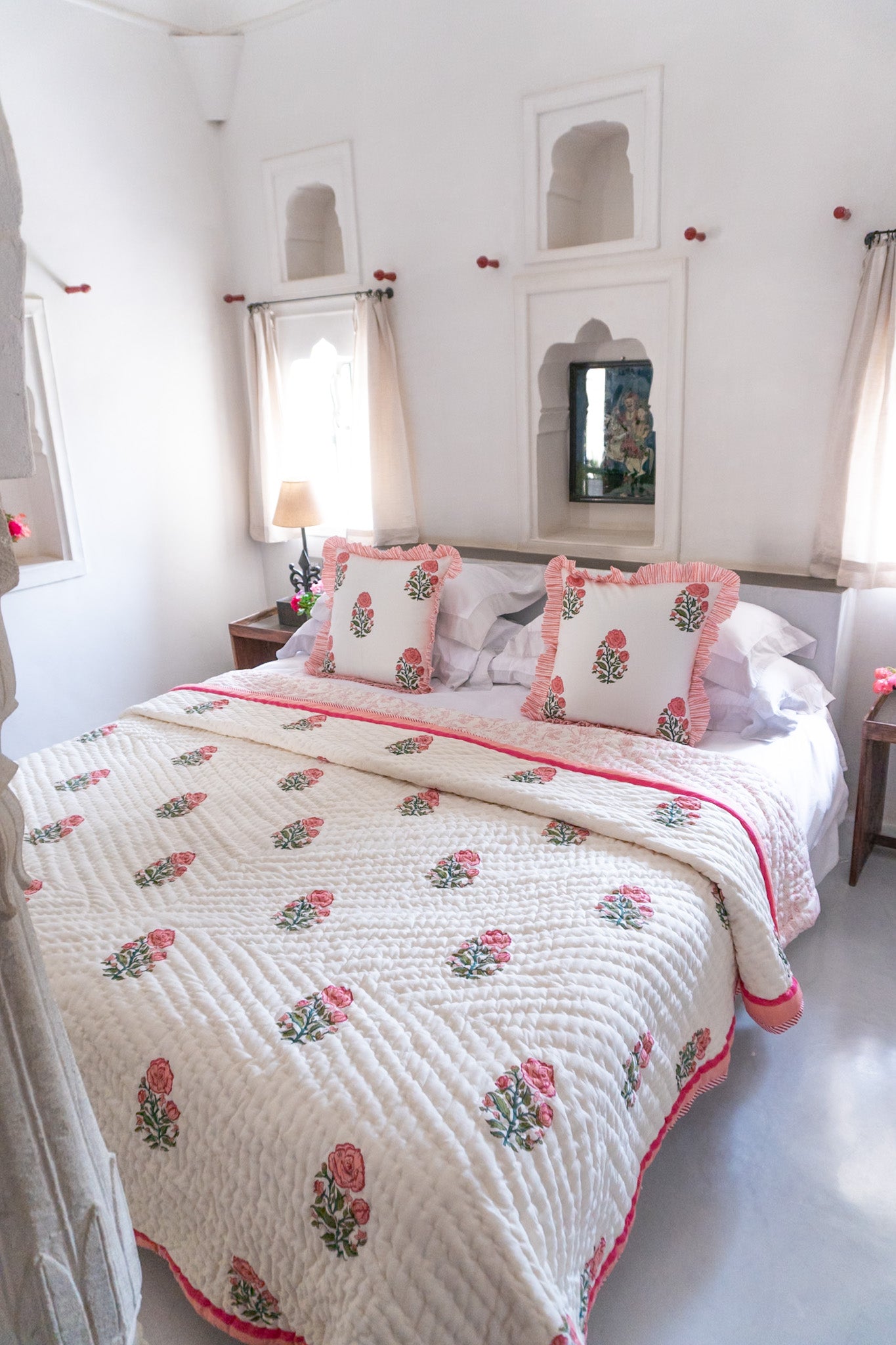 When it comes to making the bed, I love crisp white cotton sheets as a foil to the rest. It should cocoon with a mattress topper and deliciously thick duvet. The quilt dresses and brings colour to the space, even just folded at the foot of the bed. Cushions are a must especially if - like me - you like to read on the bed.