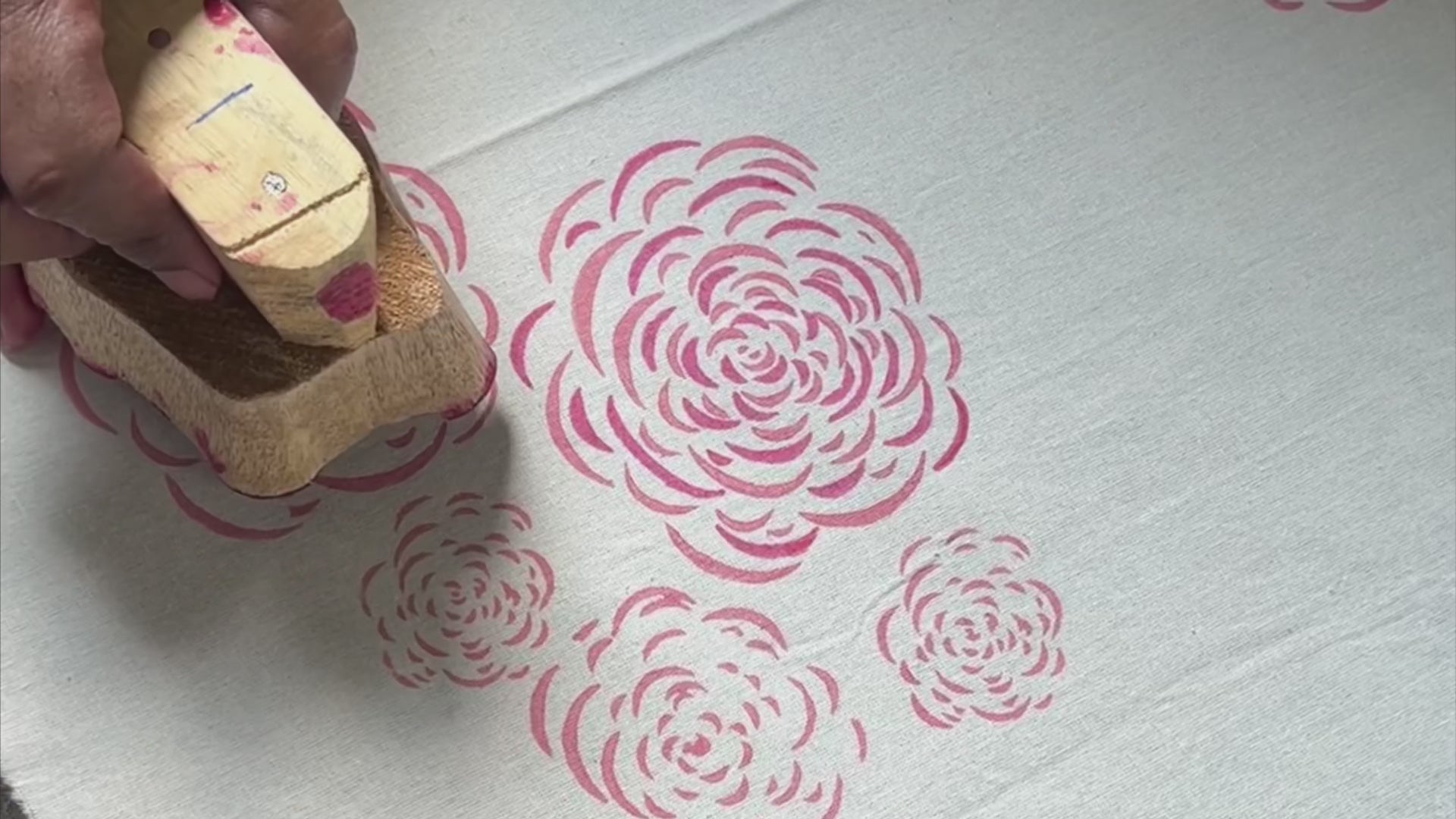 Inside, long tables covered with fabric, slowly, rhythmically being transformed: the chippas dip their blocks in shallow trays of ink, then stamp - quick, firm - and lift. Onwards they go... It is a mesmerising activity of talent at its most honed and dexterity at its most precise, not to mention an eye for detail. For example, for the two pinks in the roses of the tablecloth: the coral pink is stamped first and then the printer must place the second block, dipped in magenta, just so. Any misplacement will mean the petals overlap.