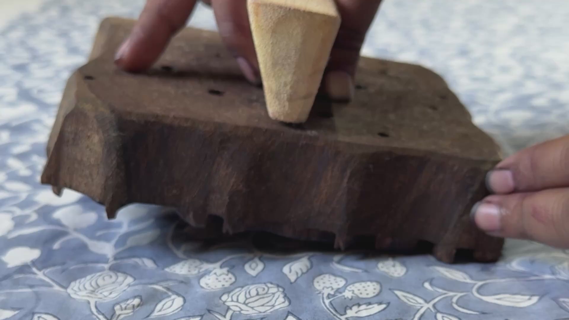 The block printing studio is my favourite place to be in Jaipur. It lights up my creativity from the moment I hear the steady, rhythmic thump thump of the wooden blocks hitting the cotton. This hand-carved block depicts roses and berries based on a tracing of my pencil drawing of the print.