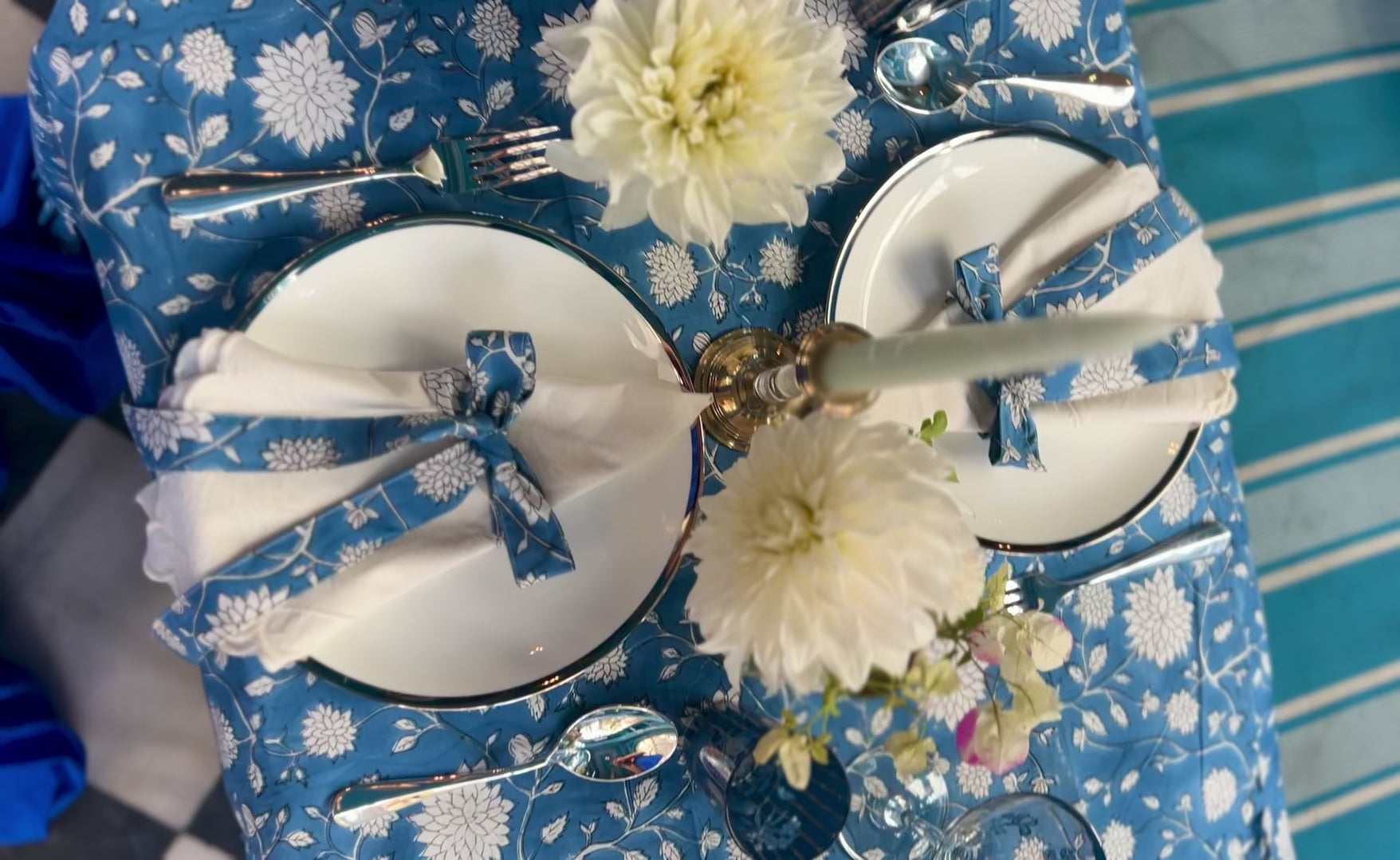A blue block-printed tablecloth with dahlias blooming across the cotton fabric. Rosanna was inspired by the cobalt blues of Jaipur's Chhavi Niwas in City Palace and the iconic Bar Palladio. The dark blue is a practical choice but there is still a flourish of fun: the 6 inch ruffle skirt at the hem!