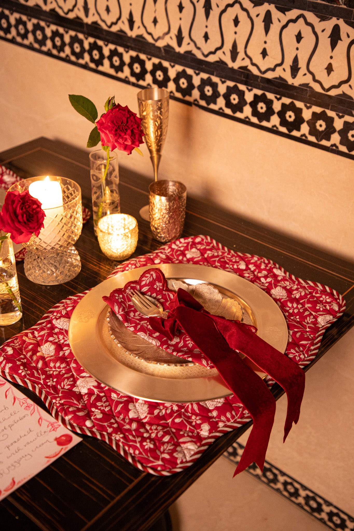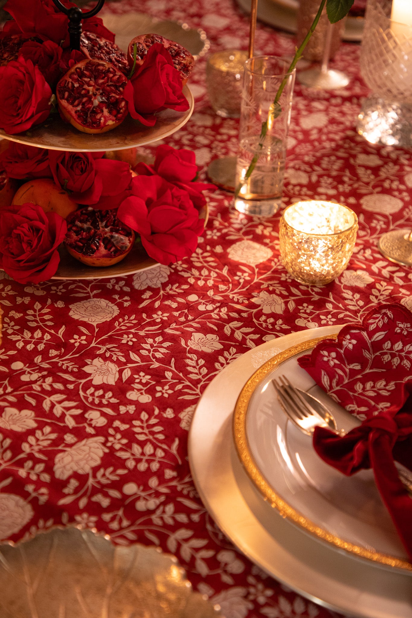 This season, I turned to winter’s quiet beauty - frost-touched flowers, deep reds and brimstone butterflies - to inspire a new block-printed table linen: Rose Orchard. Drawn by hand and printed in Jaipur, it’s an unapologetically festive design.