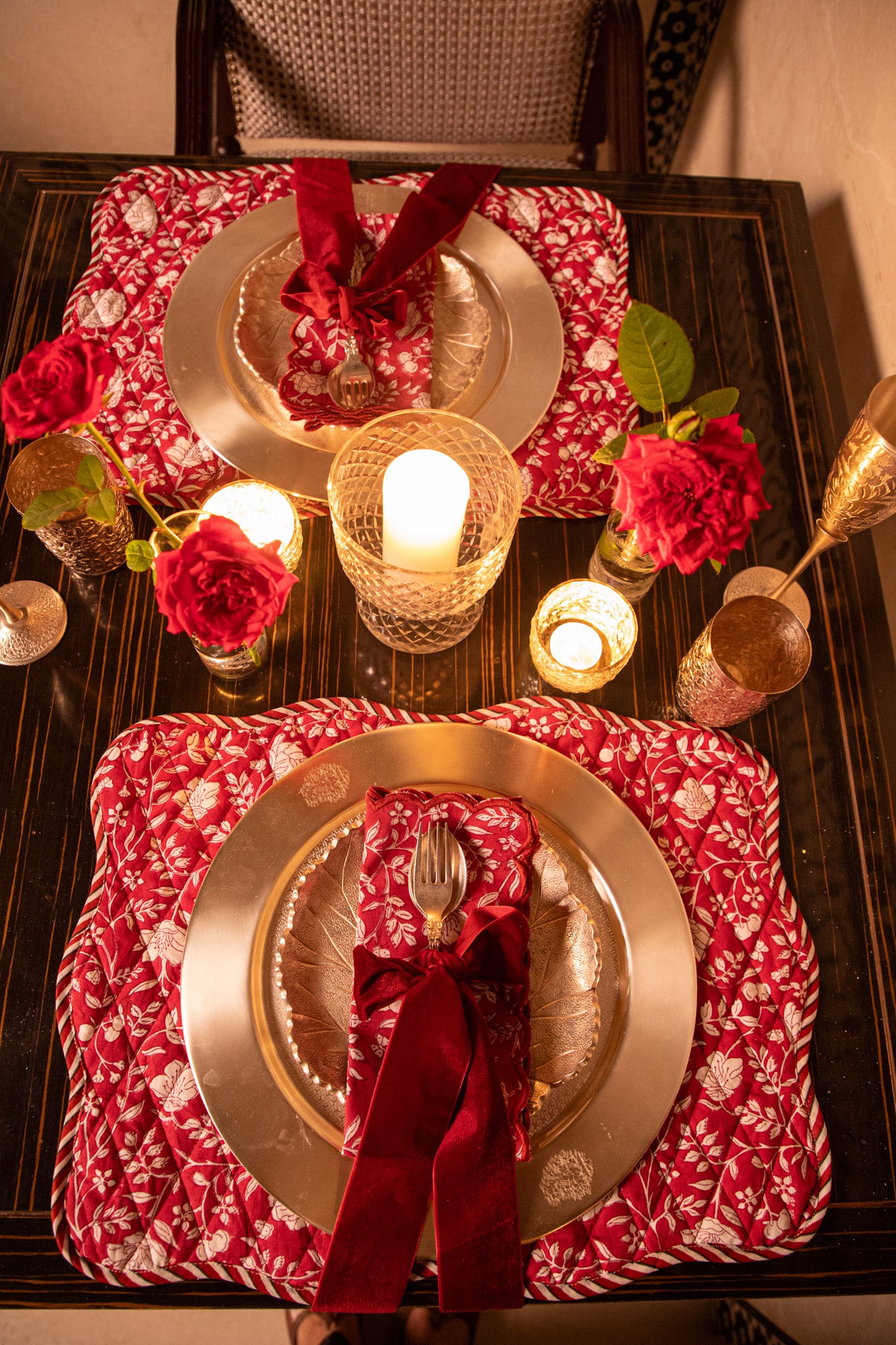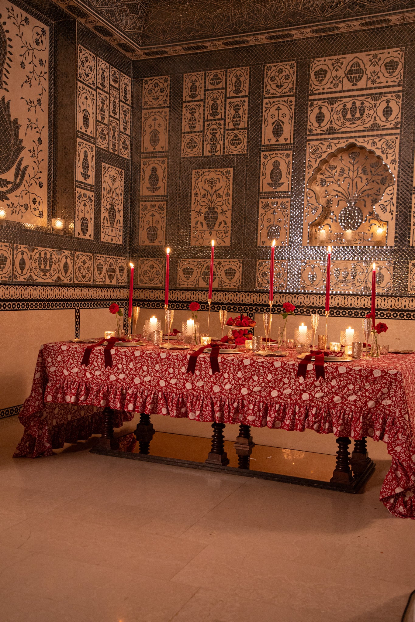 What an honour to debut the collection at Jamavar Jaipur at The Leela Palace Jaipur. Lit only by candlelight, Jamavar shimmers with the reflection of 350,000 hand-cut thikri mirrors, so I kept the styling minimal. I leant into the red colourway with matching candles and velvet ribbons, as well as a few single red roses and a delicious centrepiece of pomegranates.