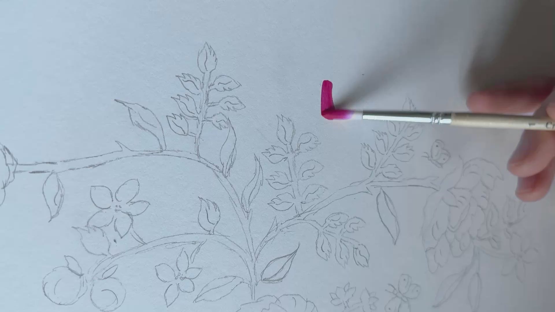 I draw prints much as I arrange a bouquet of flowers: starting with the hero - in this case, a full-petalled ranunculus - then surrounding it with foliage and complementing it with supporting blooms like the smaller snowdrops and camellias. Finally, crab apple fruits and butterflies bring freshness and movement.