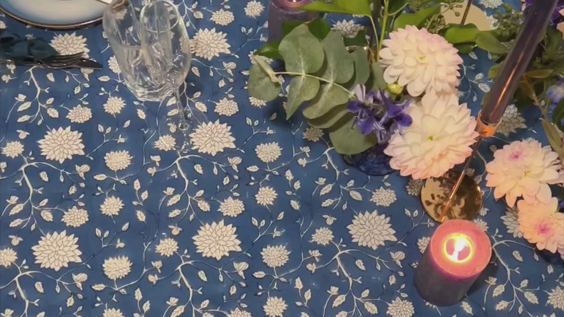 A blue block-printed tablecloth with dahlias blooming across the cotton fabric. Rosanna was inspired by the cobalt blues of Jaipur's Chhavi Niwas in City Palace and the iconic Bar Palladio. The dark blue is a practical choice but there is still a flourish of fun: the 6 inch ruffle skirt at the hem!