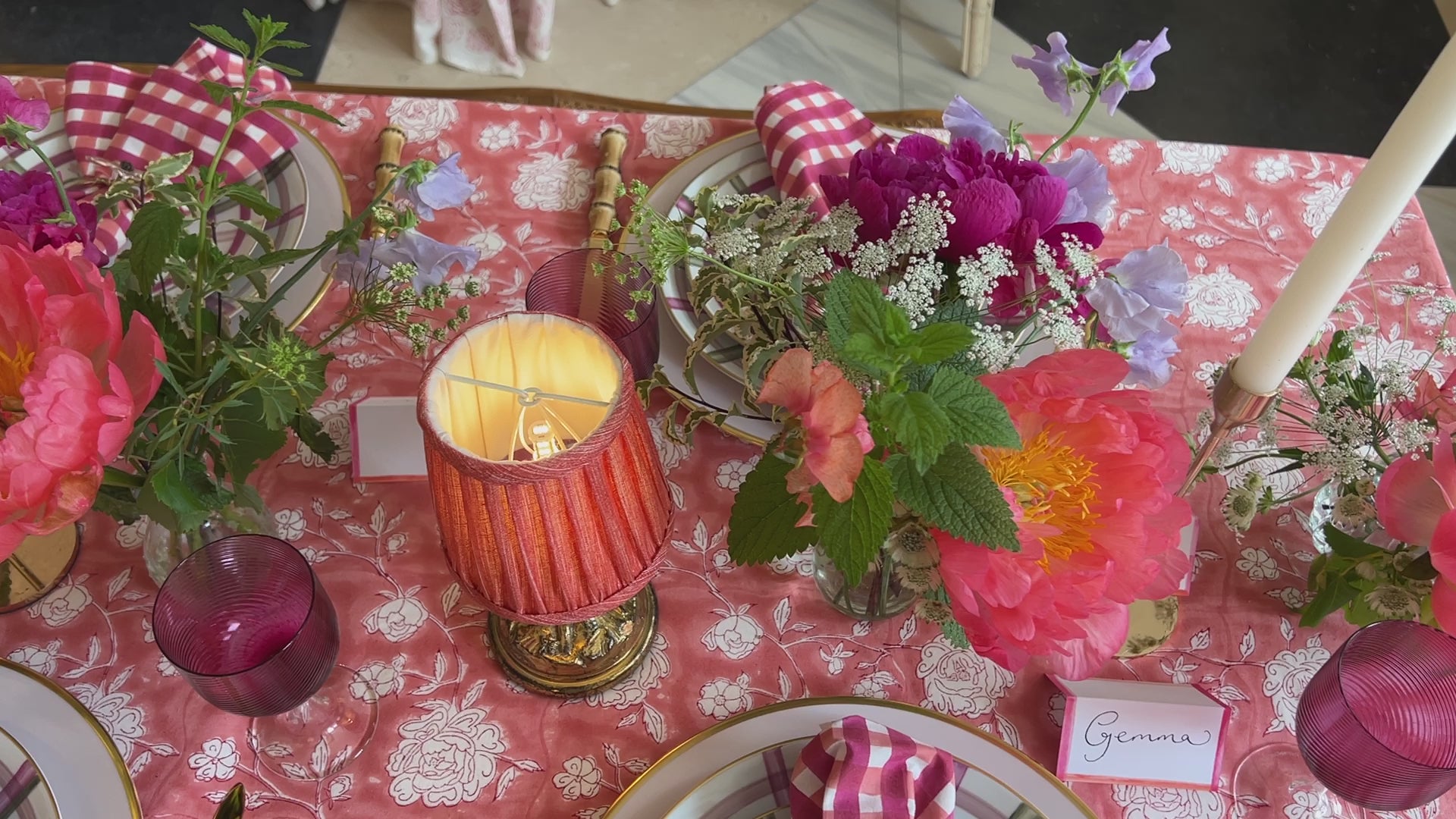 The tablescape is an ode to the Coral Sunset peony. Gemma encouraged me to be bold with this fabulous layering of hand-painted floral plates. The gingham napkins make me think of sun-drenched holidays and the napkin rings are a delight. These portable lamps from nearby Collier Webb are charming, even more so with these little 4.5 inch lampshades from Fermoie.