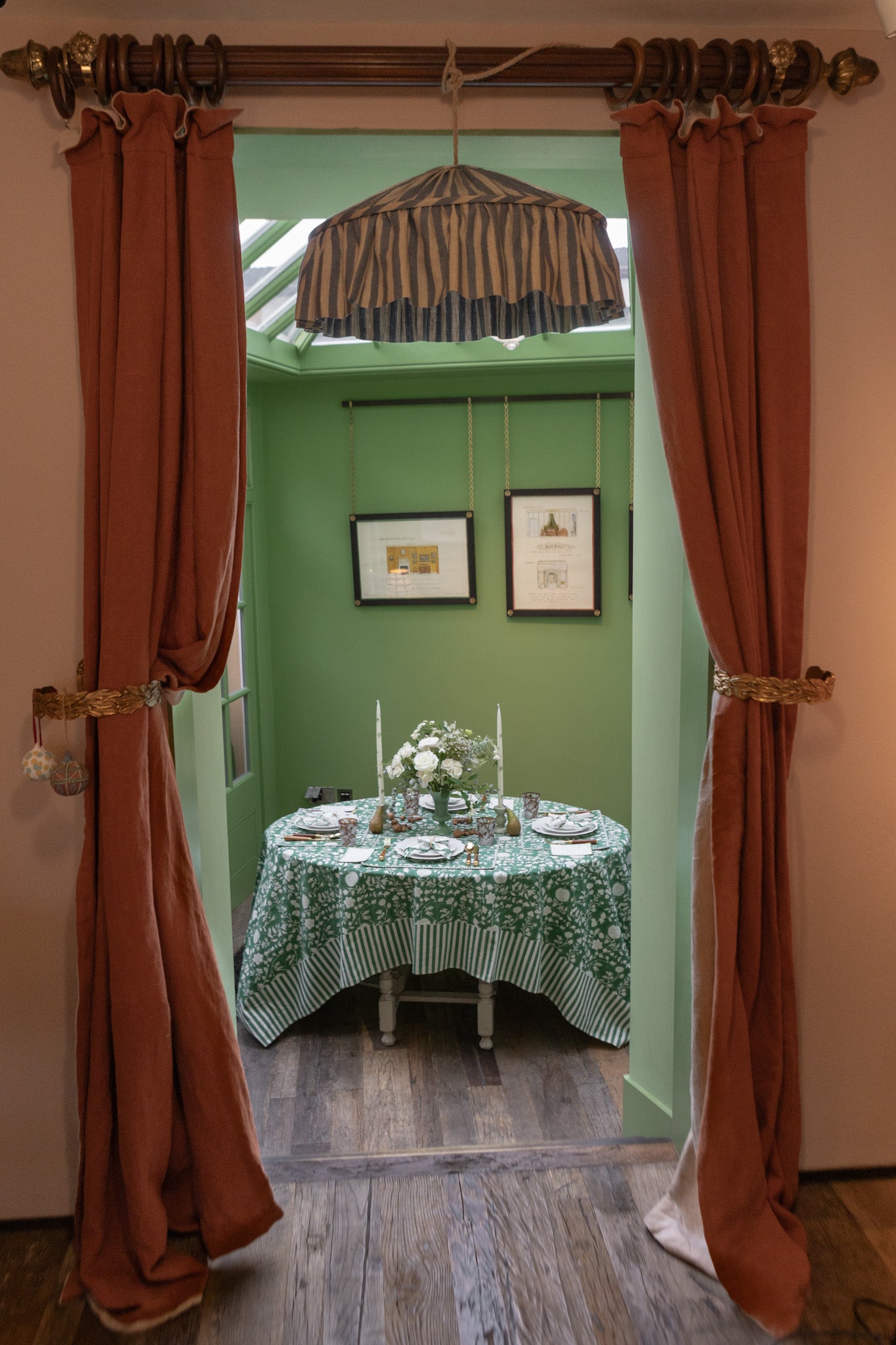 Layering up shades of the same colour is an easy route to elegance. Here, we followed nature's lead with my green tablecloth and menus and candles painted with Fine Green, Verdigris and Invisible Green (the conservatory's colour).