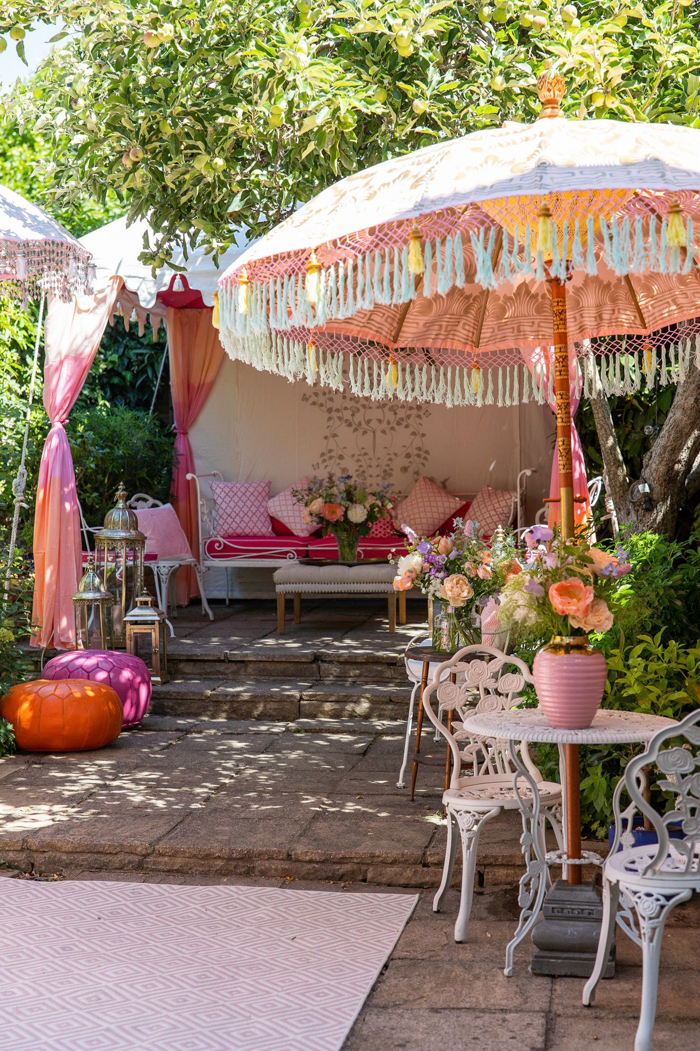 I love the way small, enclosed city gardens can be transformed with furniture; they become their own little world. The focal point for this was the pergola rented from Raj Tent Company which fitted (squeezed!) into the back of the garden. With its hot pink ceiling and ombre curtains, the colours for the rest of the furniture all stemmed from this: from the leather poufs to the cushions.