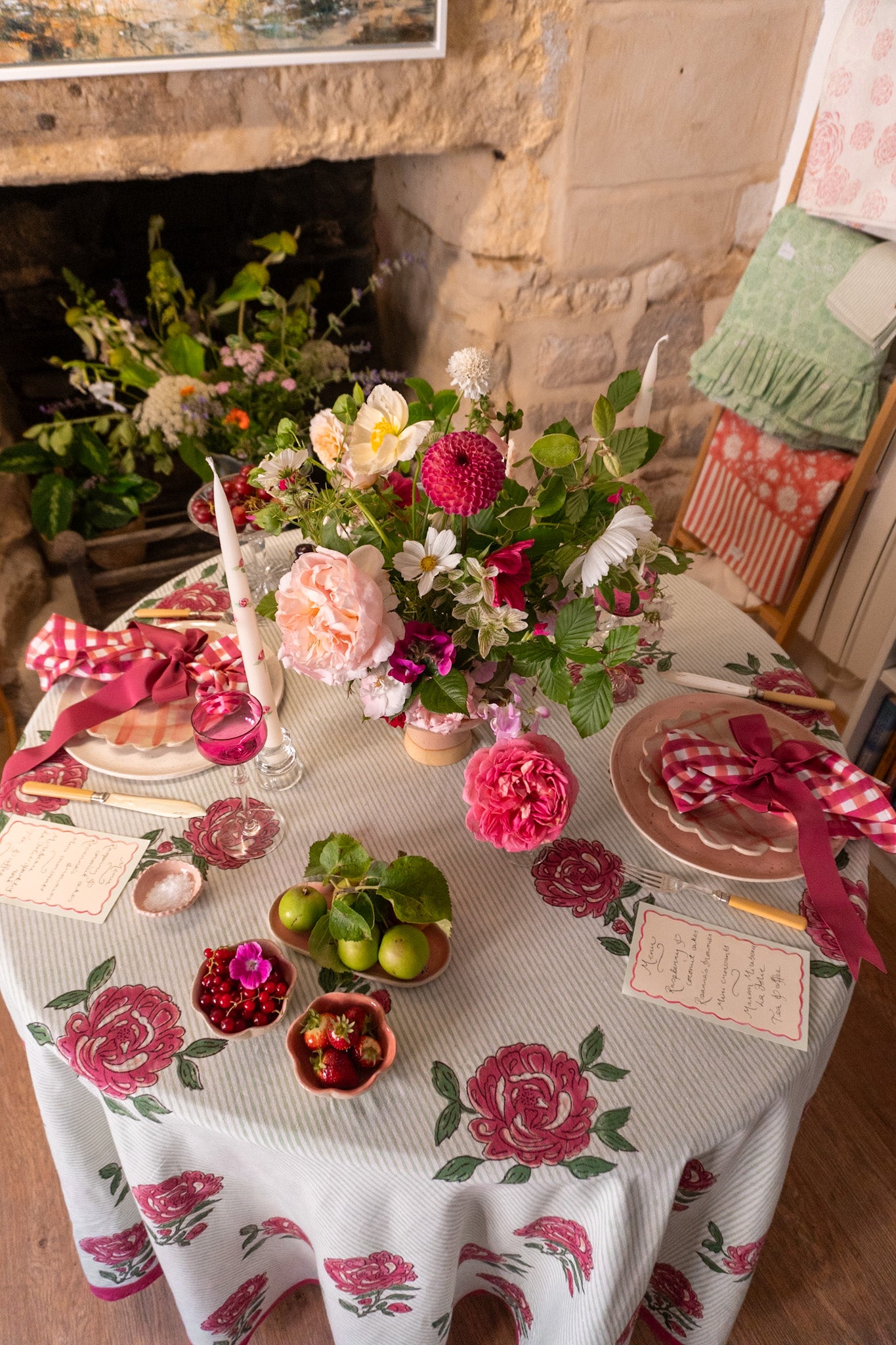 My tablescapes and dinners always begin with the seasons - from the berries on the table to the ‘Whiter Shade of Pale’ roses, nicotiana and nepeta in the floristry. I was lucky enough to source the flowers for this table directly from The Unwalled Garden near Cheltenham. Demelza grows an abundant selection of seasonal British flowers. I had my pick of mallow, nicotiana and cosmos, as well as ‘Whiter Shade of Pale’ roses as my heroes and some early dahlias. Take a look at Flowers From The Farm to find local growers near you.