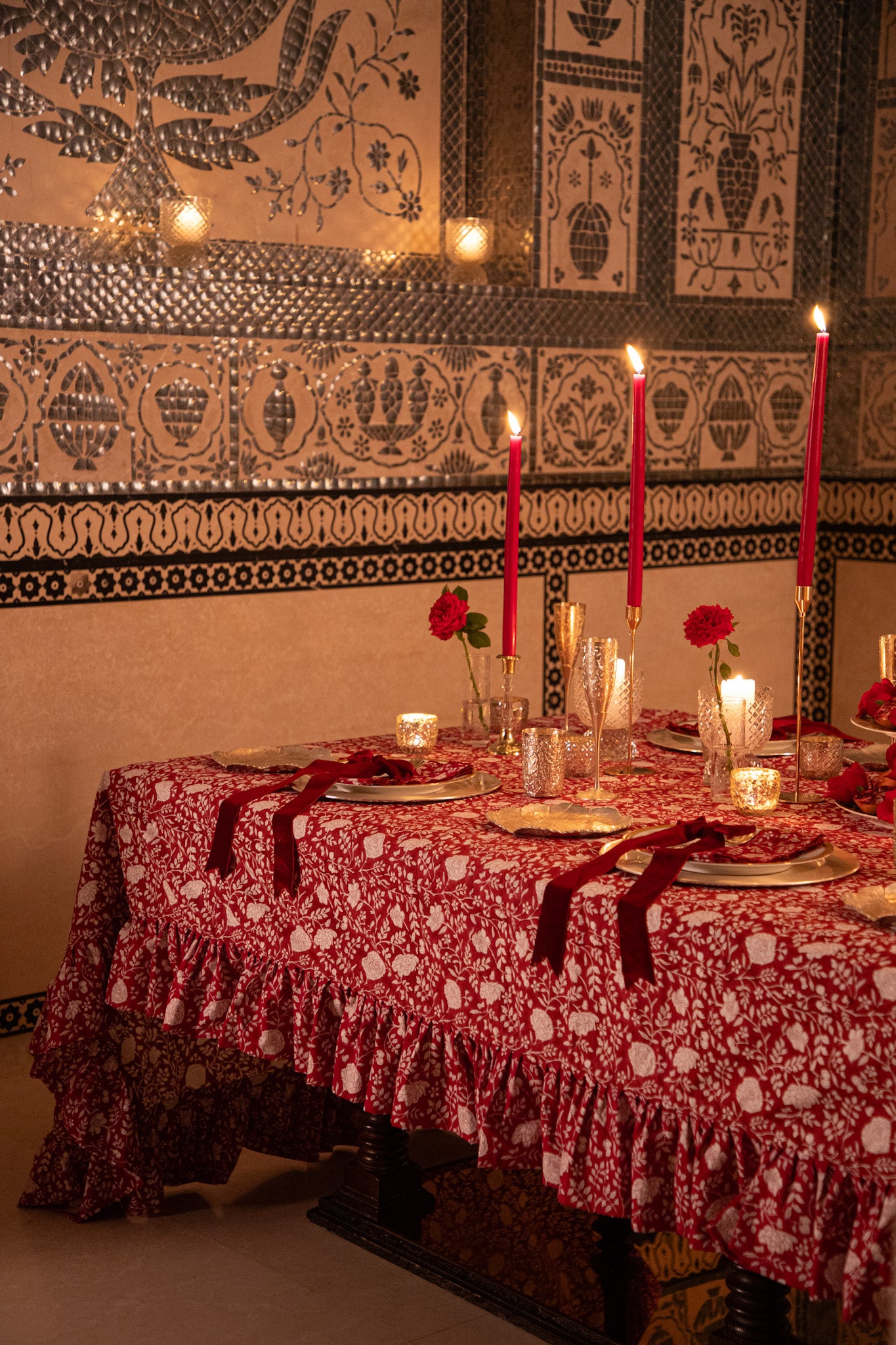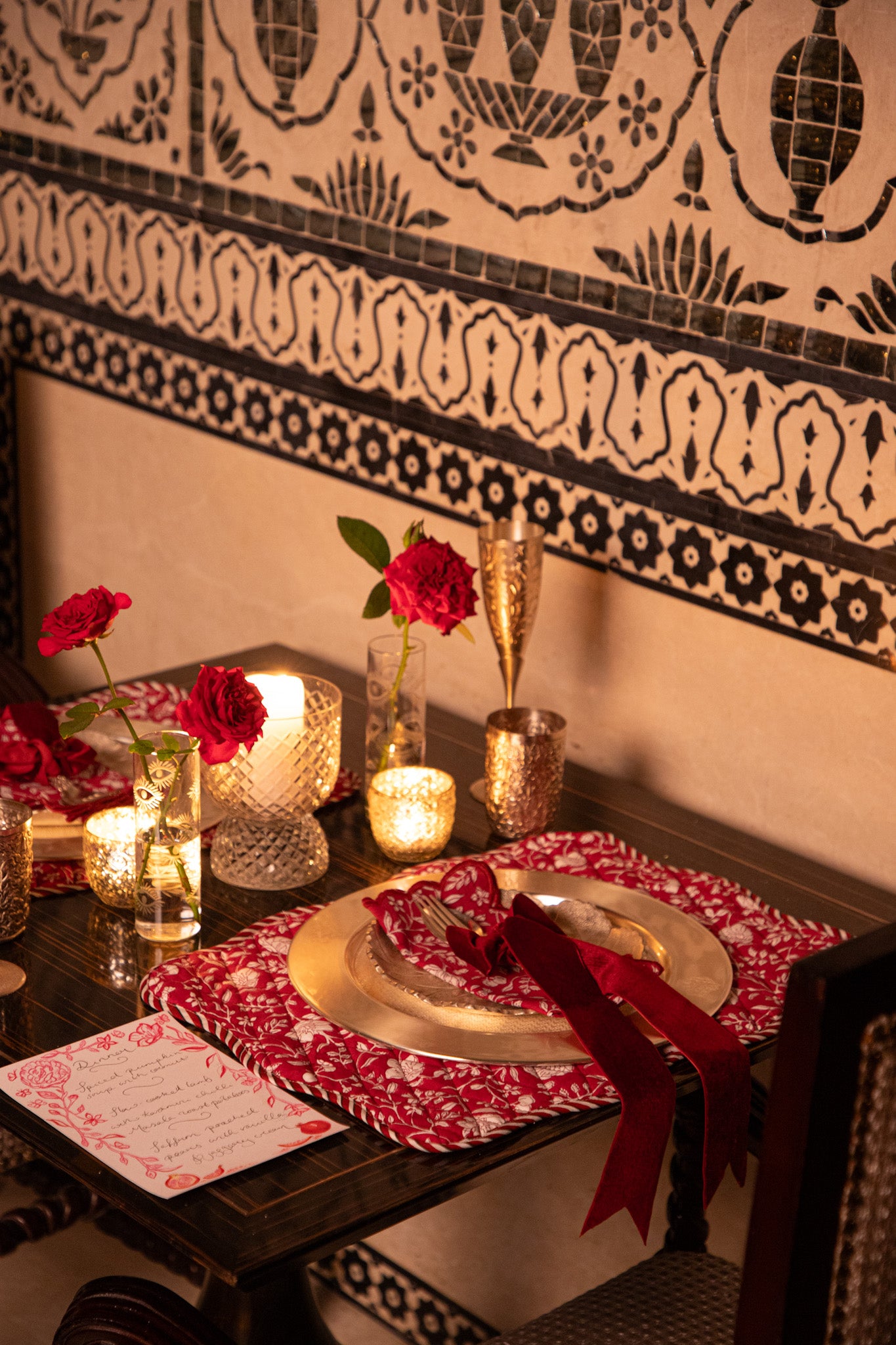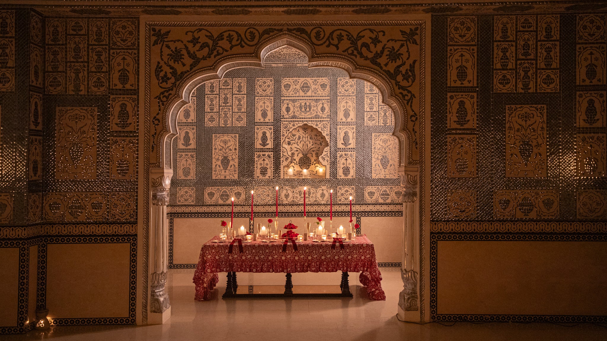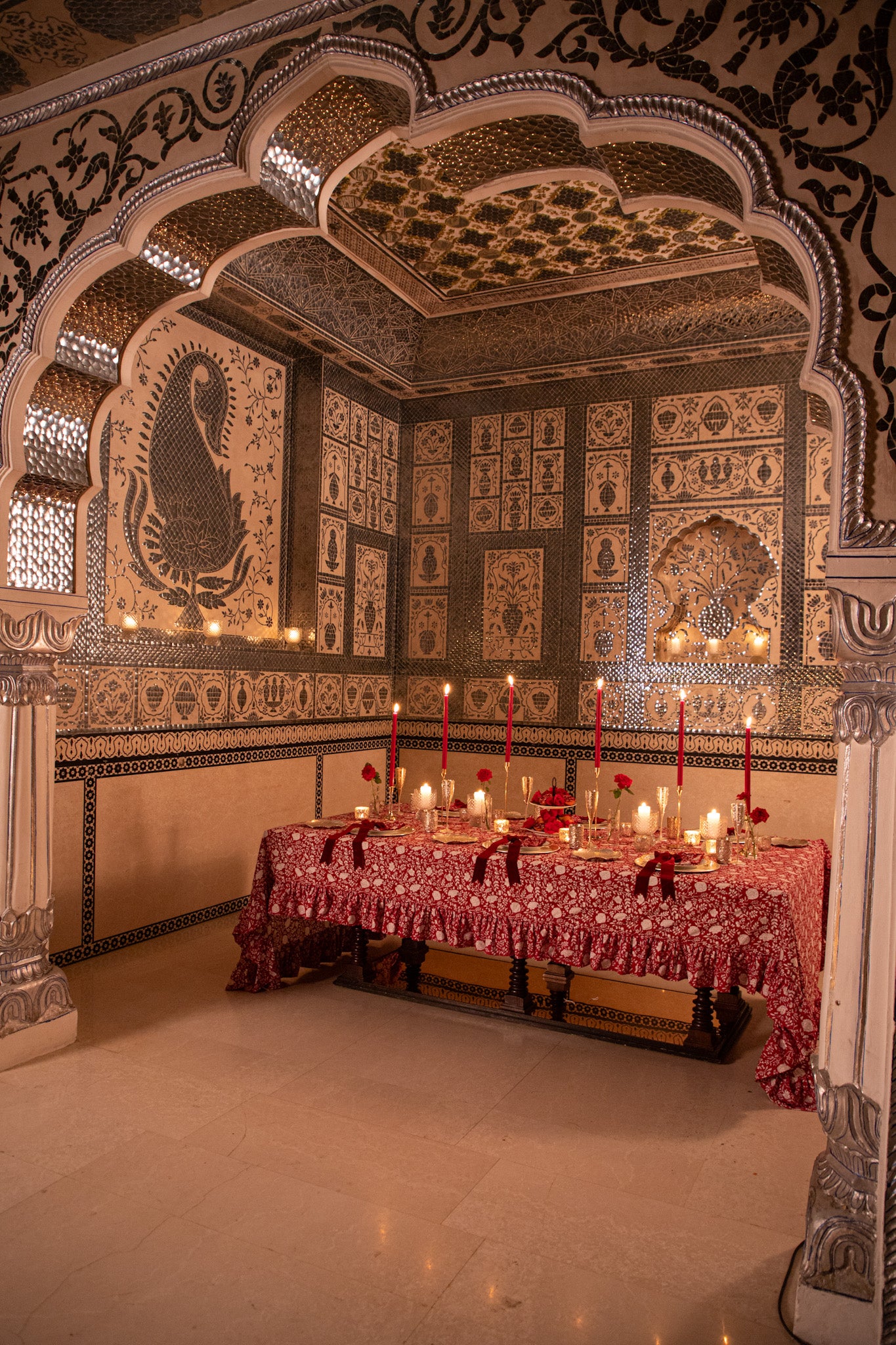 From the moment I sat beneath the sparkling ceilings of Jamavar Jaipur at The Leela Palace Jaipur, illuminated only by candles and its 350,000 hand-cut thikri mirrors, I dreamed of arranging a table here. What a place to debut this berry red collection.