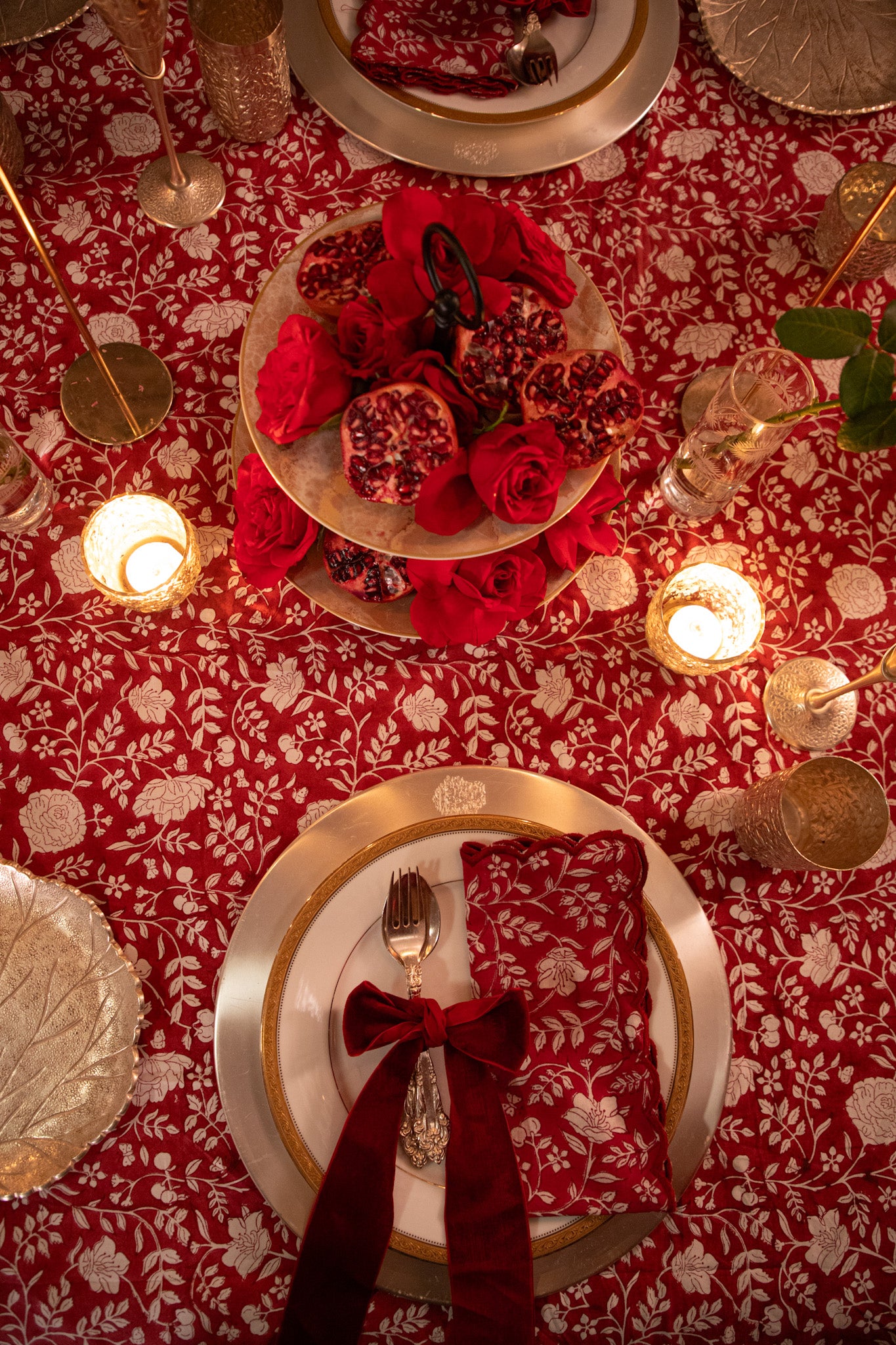With a setting this majestic, you can keep a tablescape simple, leaning into the deep berry red.  Red garden roses, cut with the longest stems possible and placed in tall glasses from Ecru Jaipur give a sculptural height to the table. For the centrepiece, cut pomegrantes and roses layered up in a two-tier étagère.