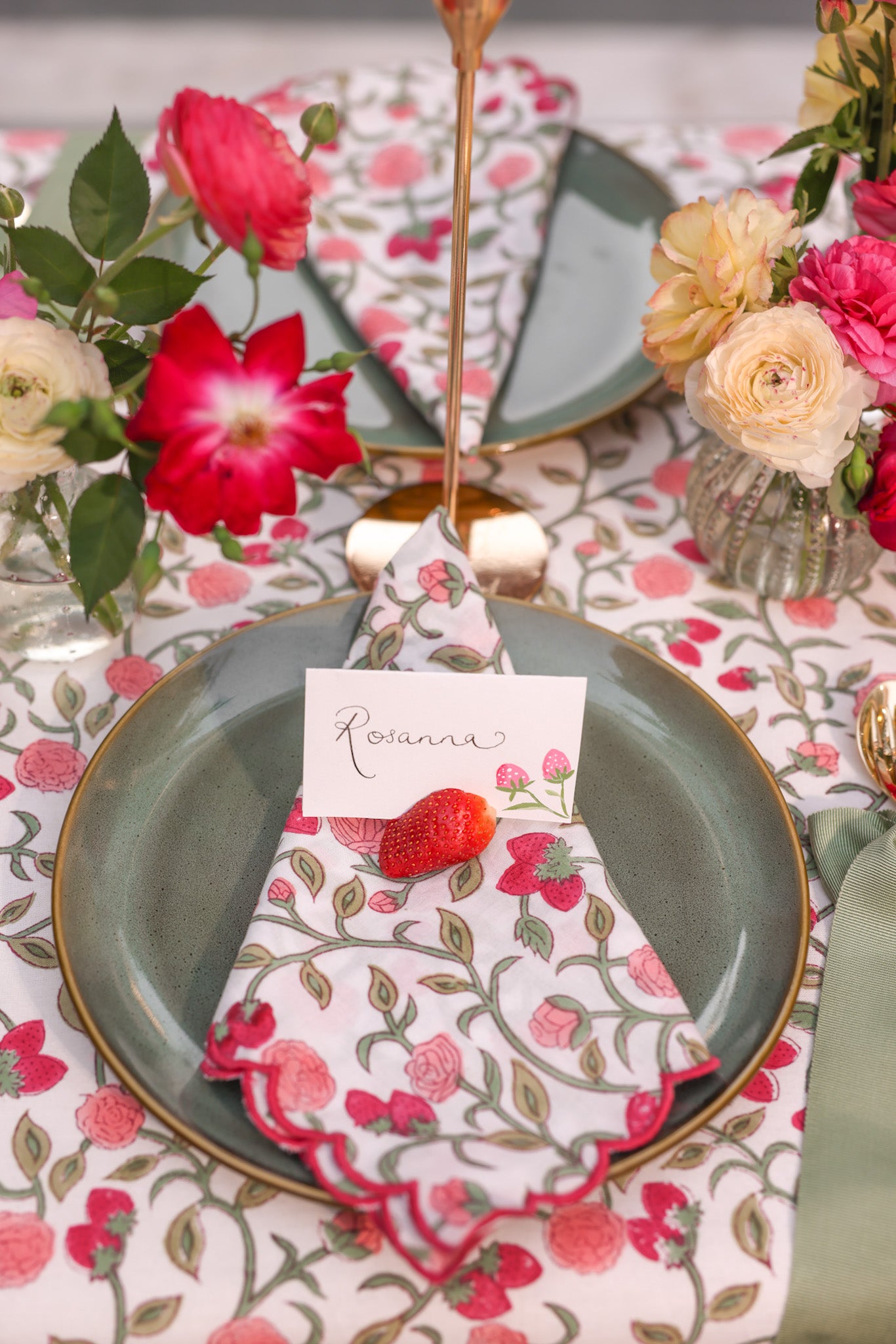 The motifs of strawberries and roses are layered print on print: tablecloth, napkins and hand-painted menus (now available to buy, my first foray into stationery!). I love a touch of whimsy so placed the place cards into sliced strawberries and painted the same on taper candles too (easy to do with acrylic and a 000 fine brush). Roses grown on our terrace in Jaipur shone in bud vases, set beside plump ranunculus, full of frilly petals.
