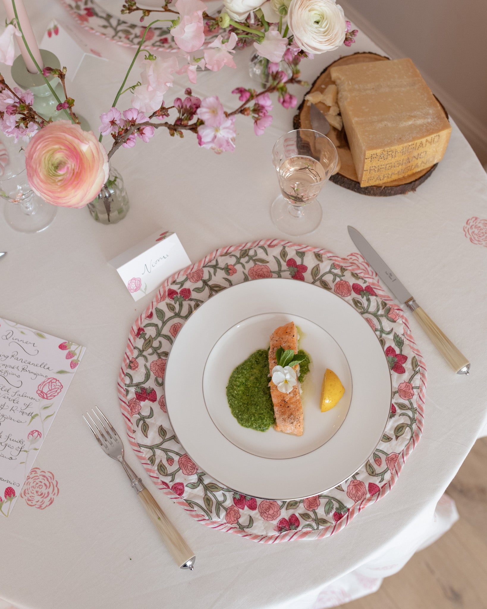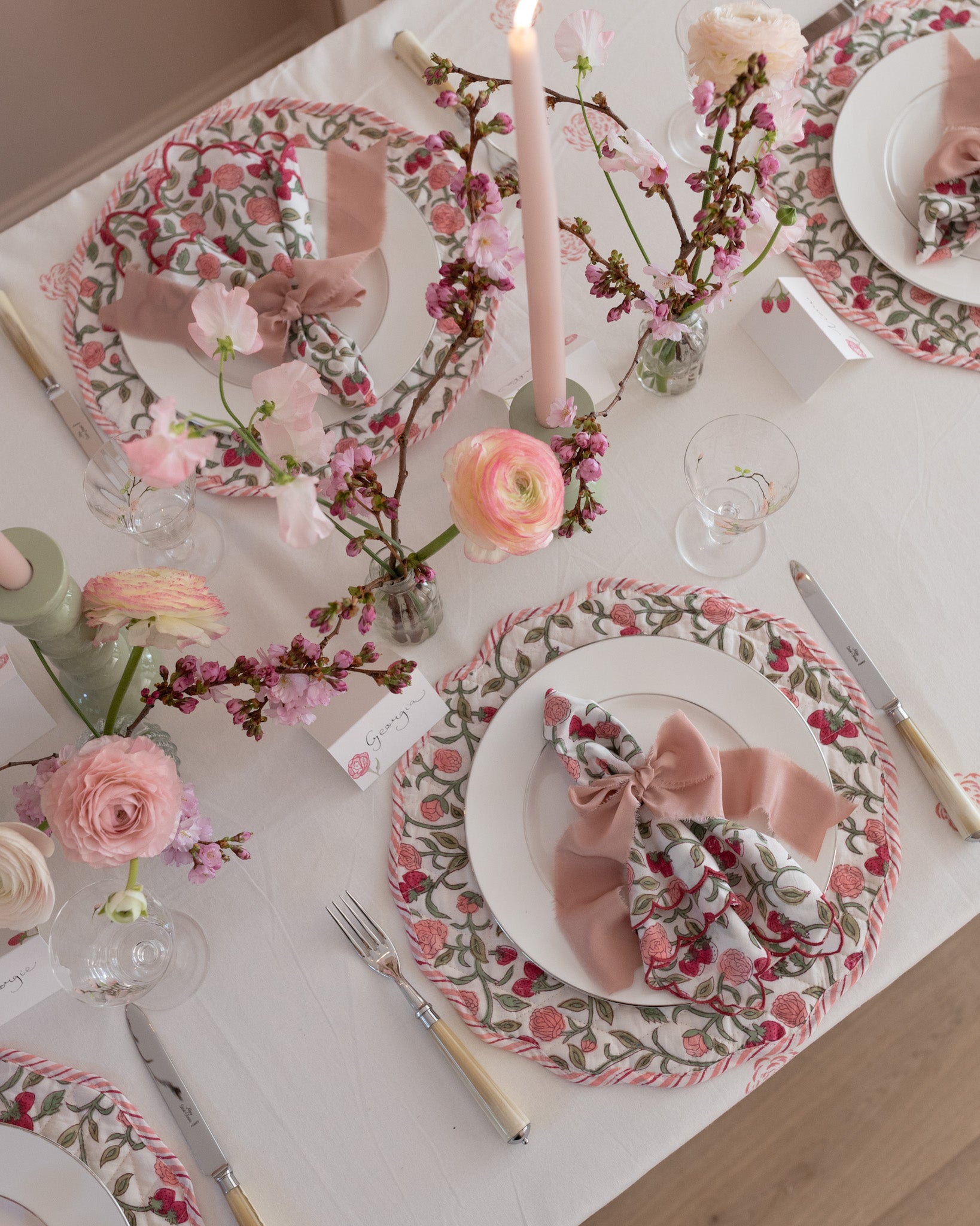 Now that I've been designing for two years, it's exciting to pair old and new designs - the Jaipur Bloom tablecloth is always an elegant pink, its pinks playing off the new placemats. Cherry blossom danced across the table, so these hand-painted glasses from Bonadea were a must. Pinks, greens and lots of personality.