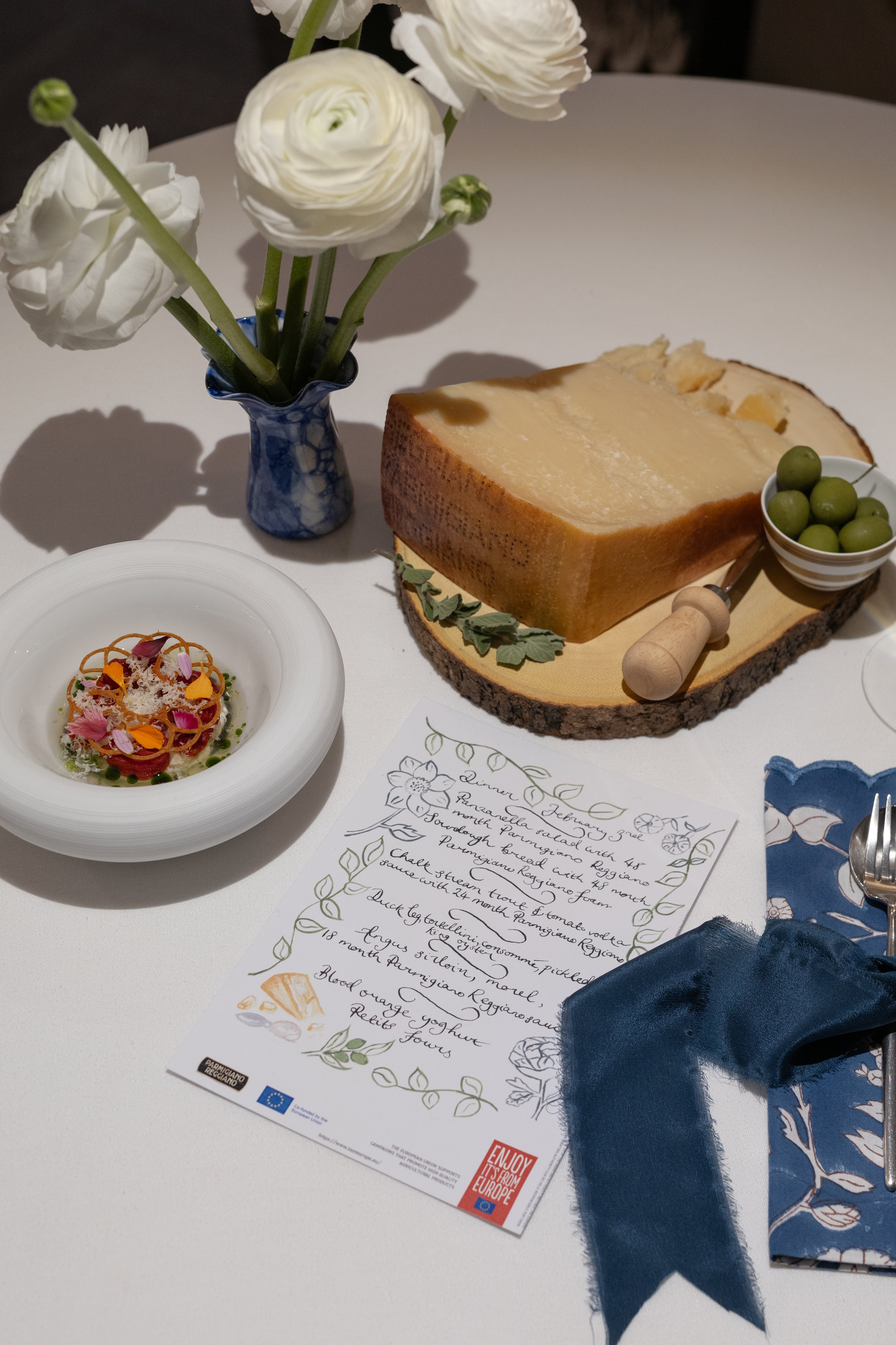 It was such an honour to co-host and style a special dinner for Parmigiano Reggiano with Sophie Rushton-Smith of The Corner Plot. For table styling, the cheese was the centrepiece with a few seasonal February flowers and pops of indigo blue to echo the striking art of the restaurant.