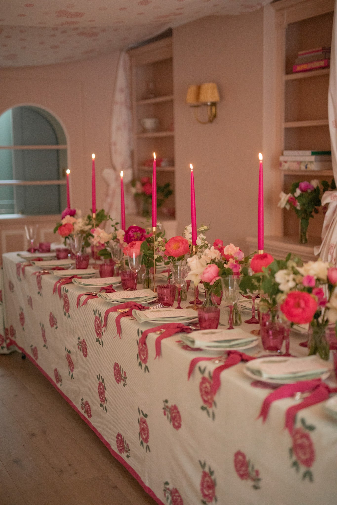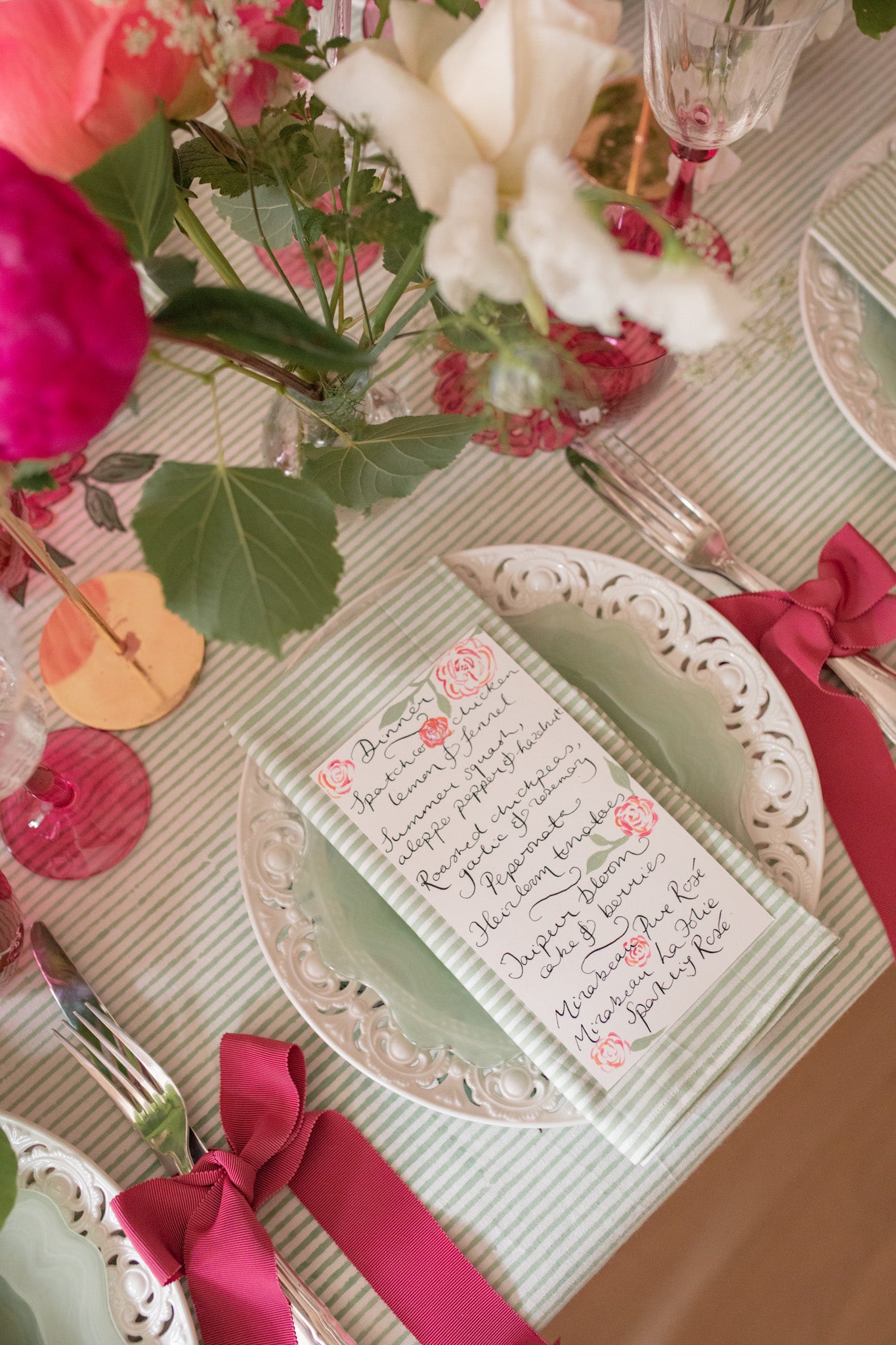 This dinner launched my new Peony Stripe tablecloth design with its cerise and peach block printed flowers over a pistachio green stripe. Pink and green lends itself well to summer parties. The plates, glasses and cutlery are all rented from The Social Kitchen who have a rainbow of colours to choose from. I especially love the green marble dessert plates. Vintage cutlery was tied in grosgrain ribbon (the colour is 'rhubarb' from VV Rouleaux). Cerise pink candles at undulating heights. And finally, hand-painted menus... They took me a very long time!