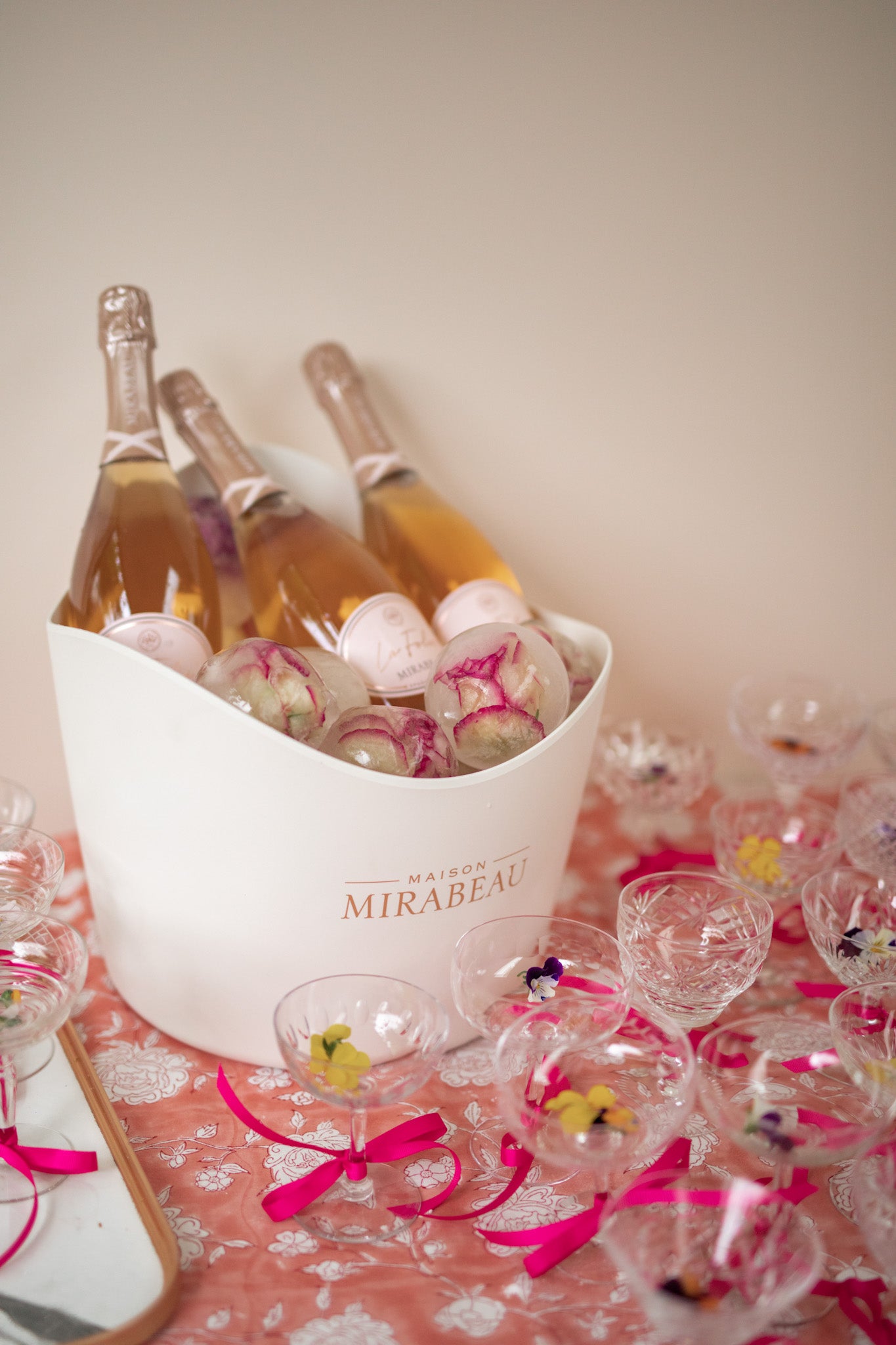 - A glass of something chilled the moment your guests arrive. We served Mirabeau La Folie Sparkling Rosé with viola flowers dancing in the bubbles and pink bows tied around the coupes.
