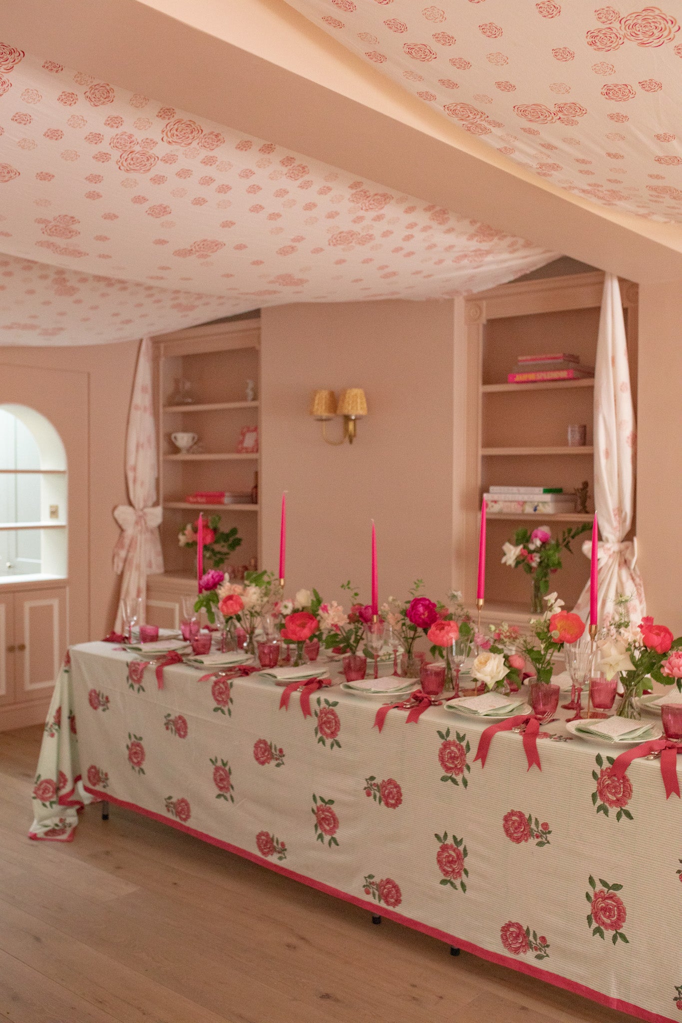 ...And vice versa. We brought the indoors outdoors by moving our furniture into the tent, adding cushions and even scenting it with incense from Forest Essentials. In the same way, I wanted the ground floor to feel romantic in that heady, high summer way. I created a canopy using my Jaipur Bloom print hung from hooks in the ceiling. Drapes in the same fabric dropped to the floor. The fact our furniture was outside (and at neighbours' houses!) meant we had space for a long table to seat 30.