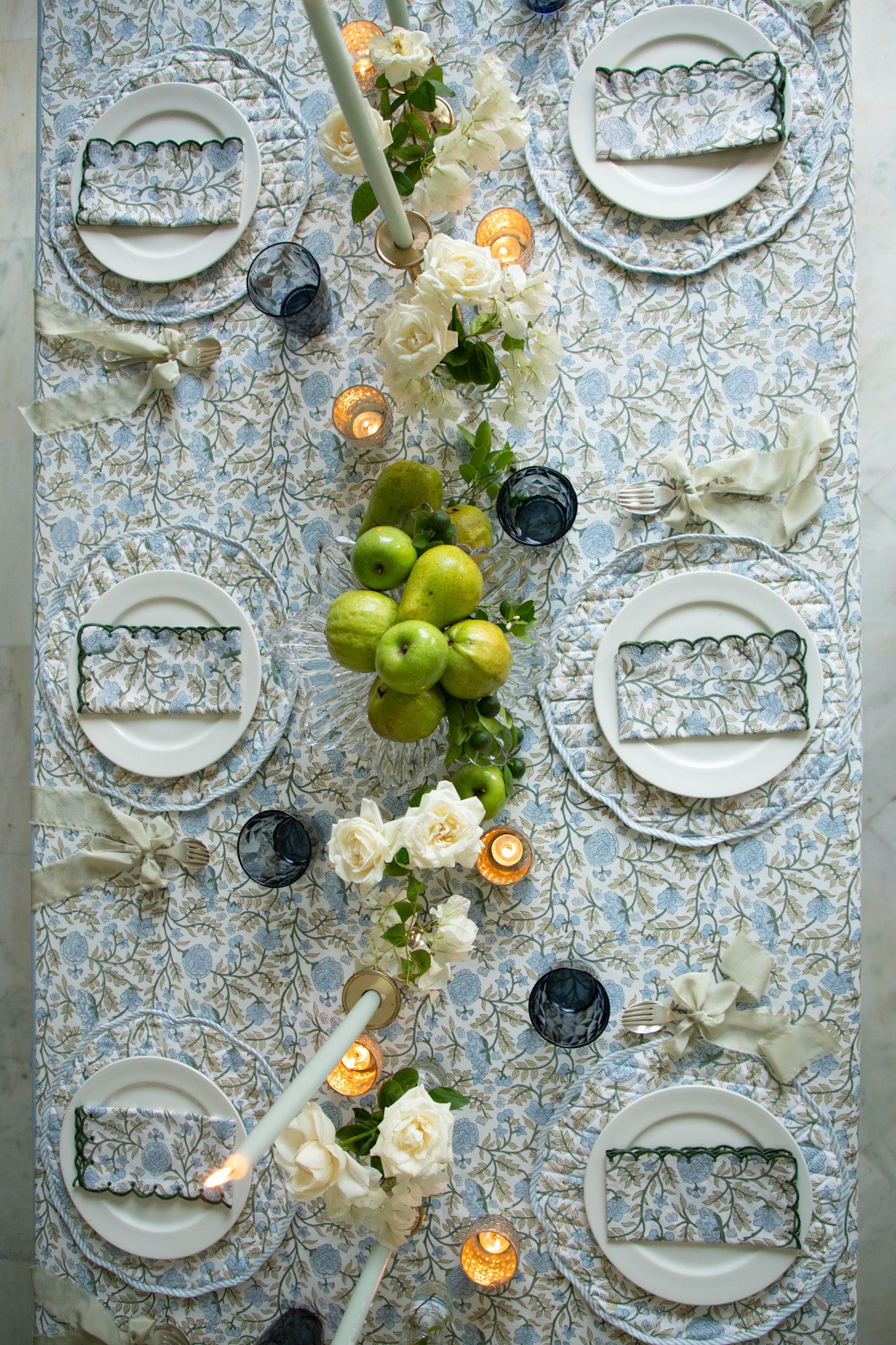 The exclusive Rose Orchard block print design intertwines whimsical camellia and hellebore flowers with brimstone butterflies, all framed by a scalloped stripe border. Softly quilted for a refined finish. Matching napkins available.
