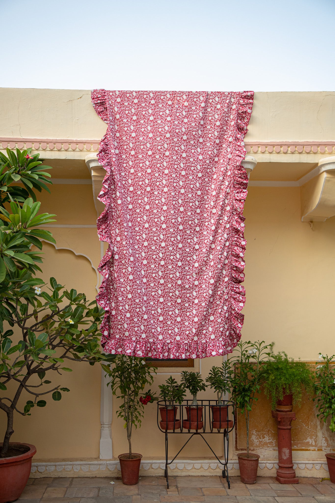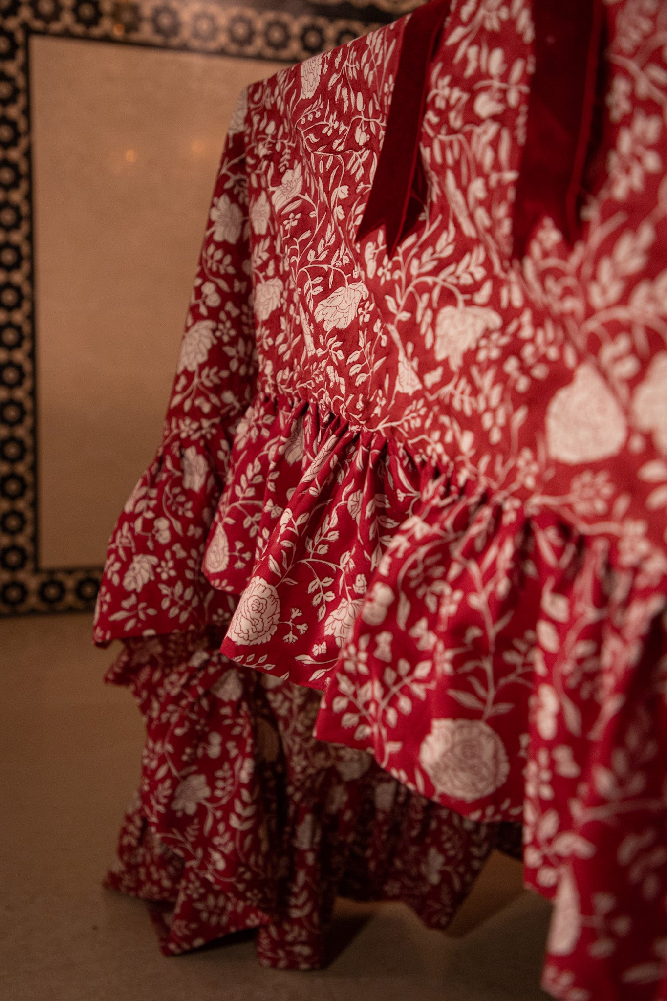 A deep red tablecloth to set the scene for festive winter nights. Drawing inspiration from the flowers that bloom bravely in the cold, Rosanna hand-drew meandering hellebores, snowdrops and camellias. Look closely and you'll even see winter's brimstone butterflies. The design was then traced, carved into teak wood, and block-printed by the talented artisans with whom she works in Jaipur. The tablecloth is finished with a 6-inch ruffled hem.