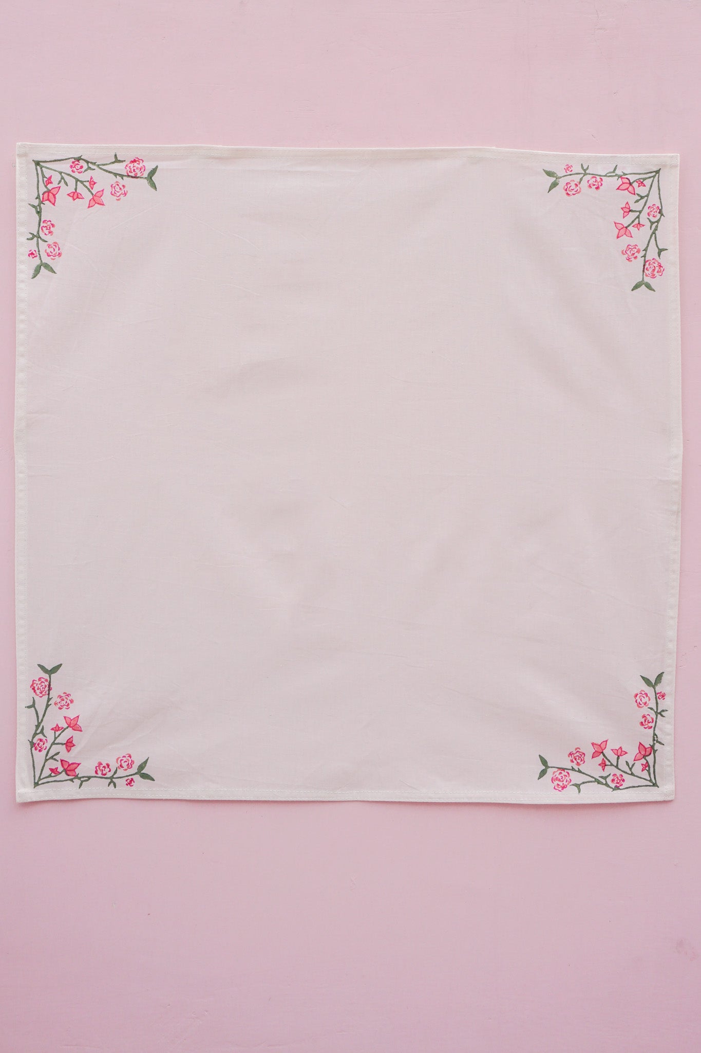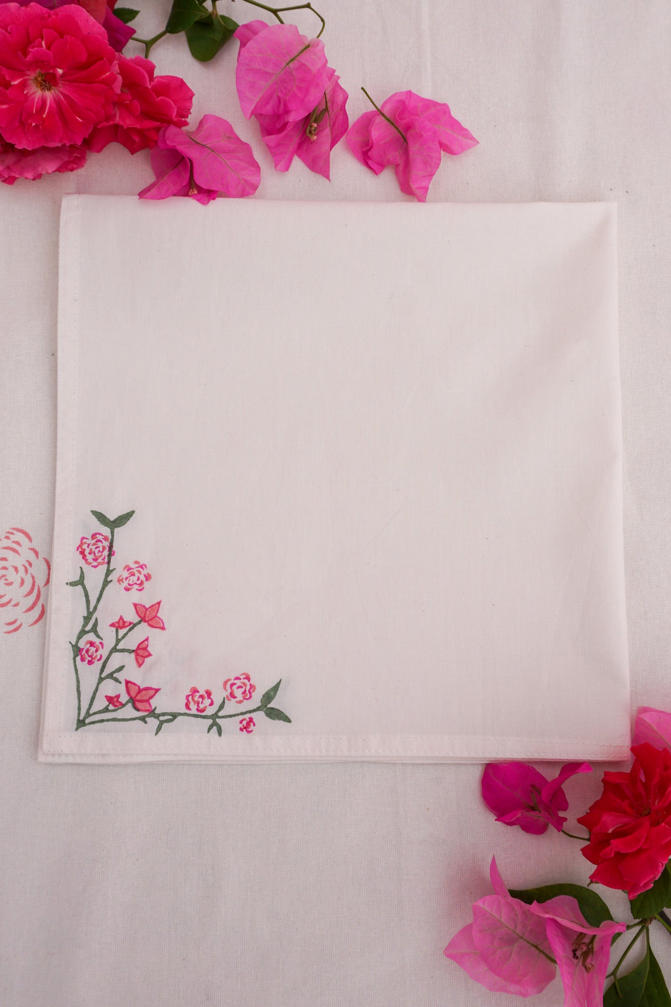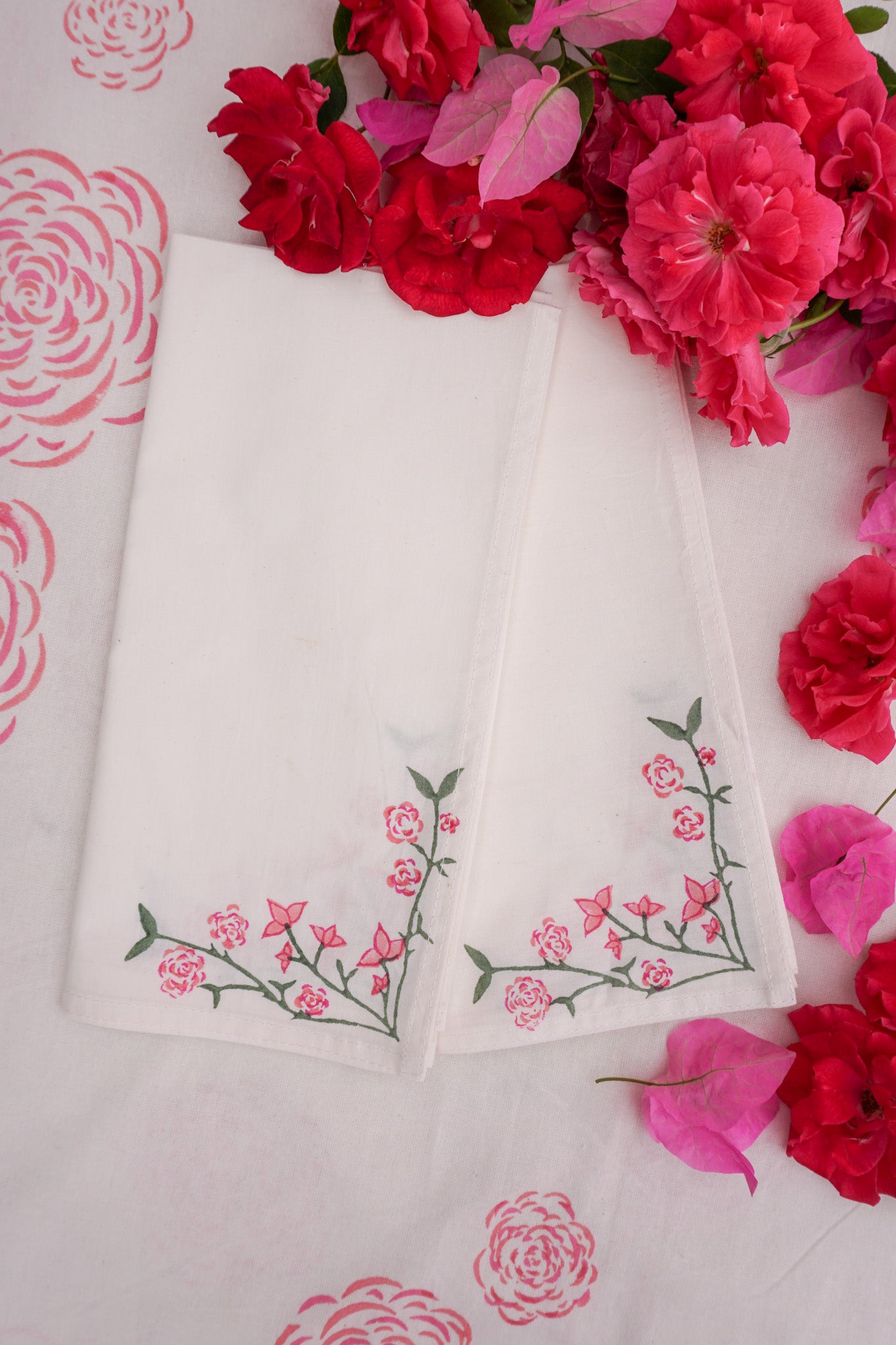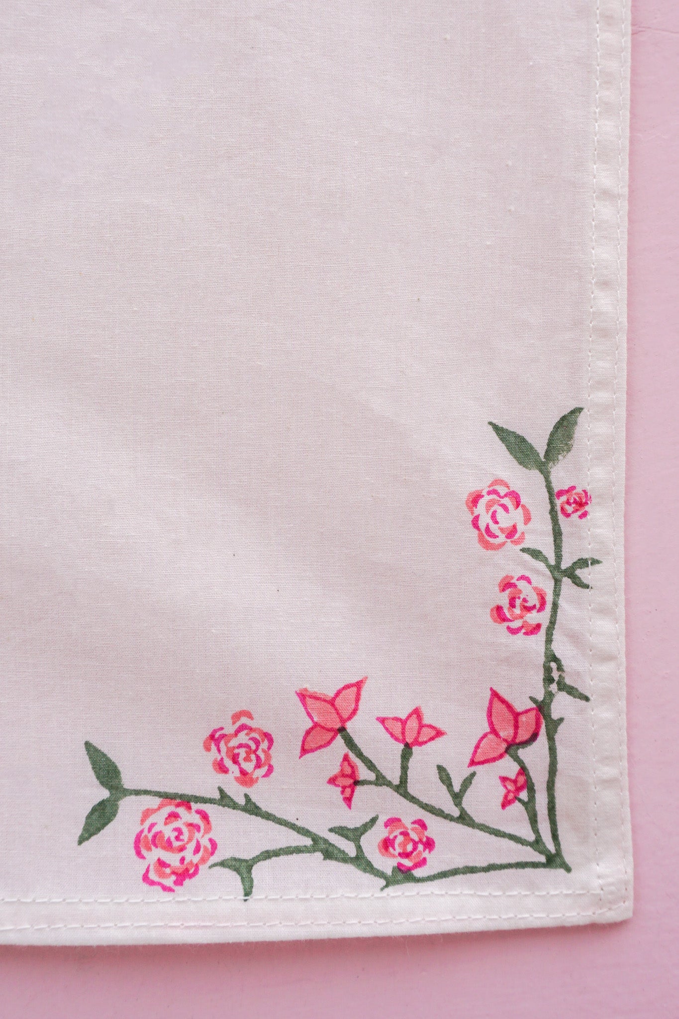 A pair of napkins in the Jaipur Bloom print. These were Rosanna's first design, inspired by evenings on her terrace in Jaipur, where bougainvillea bloomed and roses formed the table centrepiece. Rosanna's hand-drawn florals were carved into a wooden block print. This was then stamped by hand onto Indian cotton using the ancient technique of block printing, for which Jaipur is famed. It is a craft that has been handed down from generation to generation. No two napkins will be quite the same due to the hand-technique used. Each corner of the napkin features the design so there are lots of ways to style it.